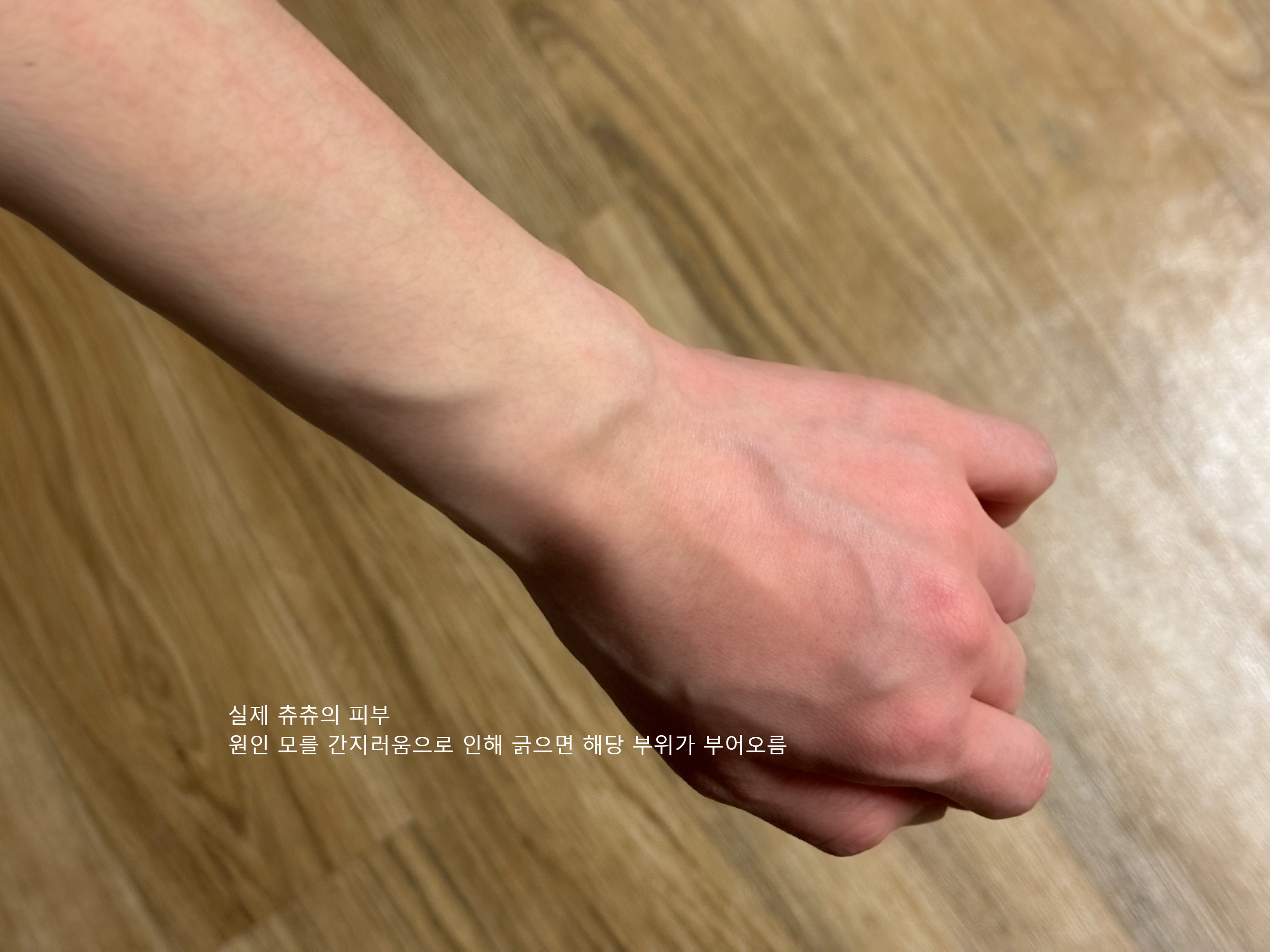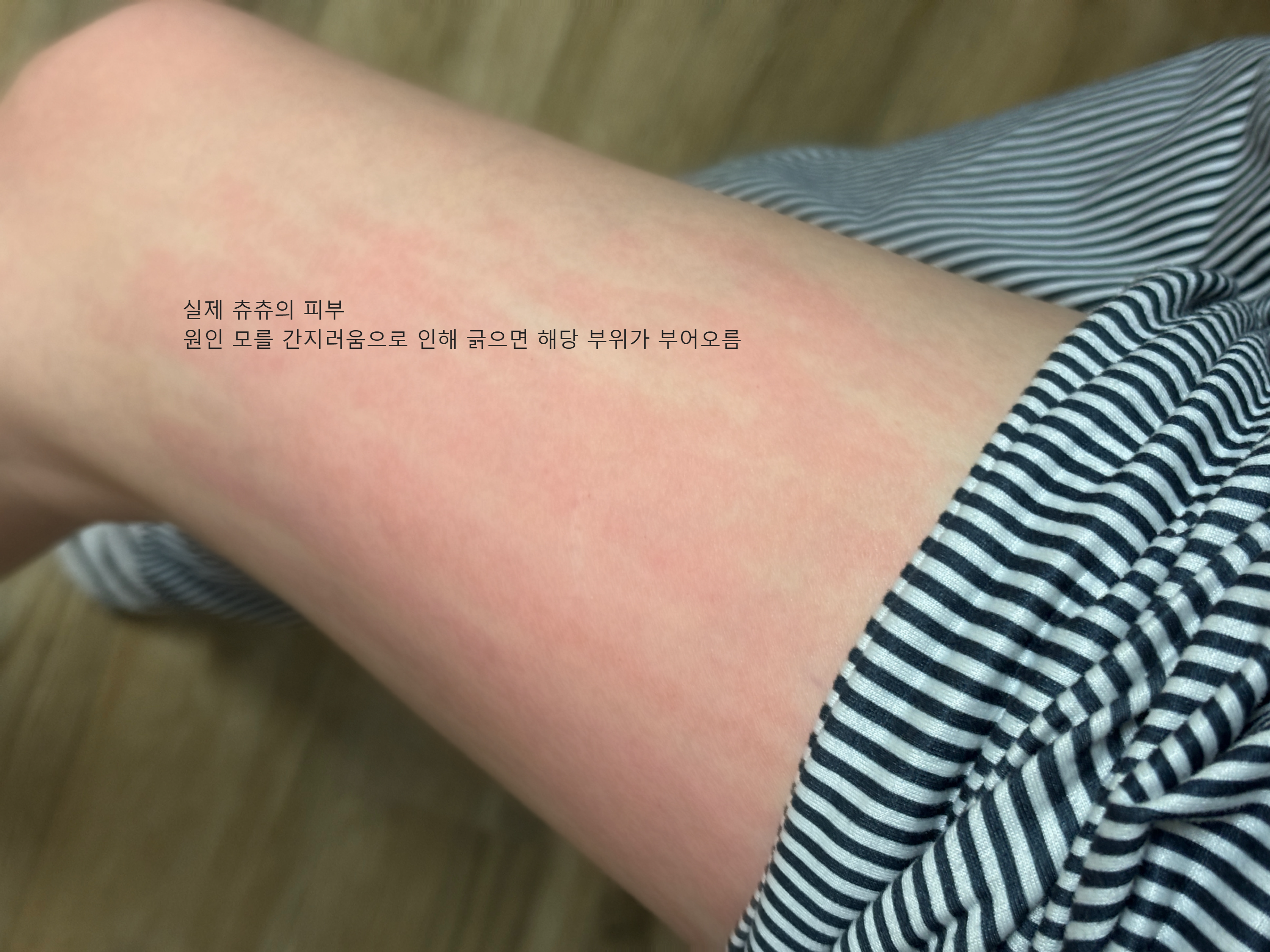 ^ 실제 츄츄의 피부. 한동안 잠을 제대로 못 자서 그런지 면역력이 뚝 떨어져 피부가 간지럽기 시작함. 긁으면 부어오르고 분명 간지러워서 긁었는데 손을 데면 아픔 ㅜㅜ